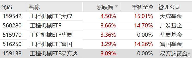 工程机械上涨,中国沉汽涨超7%,徐工机械、潍柴动力、三一沉工上涨,带动工程机械ETF大成涨超4%,工程机械ETF、工程机械ETF华夏、工程机械ETF易方达涨超3%。